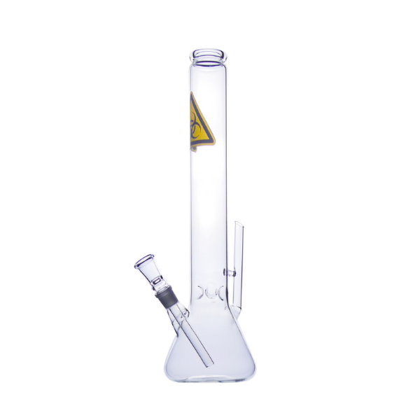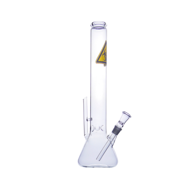 Bongo de vidro transparente com sinal “biohazard”na parte superior do tubo. Mede 42 cm de altura e tem bocal arredondado e formato beaker. Dispõe de “kick-hole”. No interior existem 3 pinos, que permitem usar com gelo.