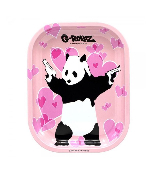 Tabuleiro da G-rollz, com a imagem de um grafitti de Banksy, o “Gunnin” panda . Cor de rosa.