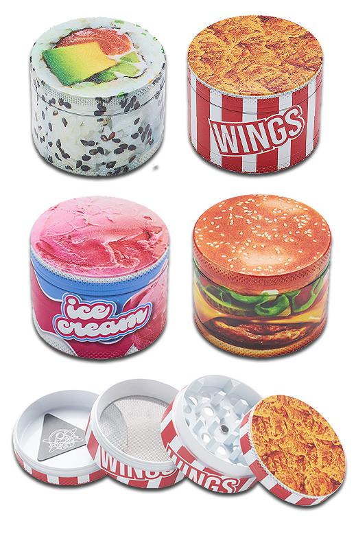 Grinder de 4 partes em metal da marca Champ-High, coleção Yummy. Design divertido inspirado em receitas populares com 4 modelos disponíveis (Sushi, Hamburguer, Chicken Wings e Gelado). Este ralador “delicioso” tem 50 mm de diâmetro e combina funcionalidade e humor, tornando a moagem prática e descontraída. A sua construção metálica de alta qualidade garante durabilidade e eficiência, proporcionando uma experiência de moagem consistente e sem esforço. Compacto (5,0 x 5,0 x 3,7 cm) e leve (105 g), cabe facilmente em mochilas, caixas e gavetas.